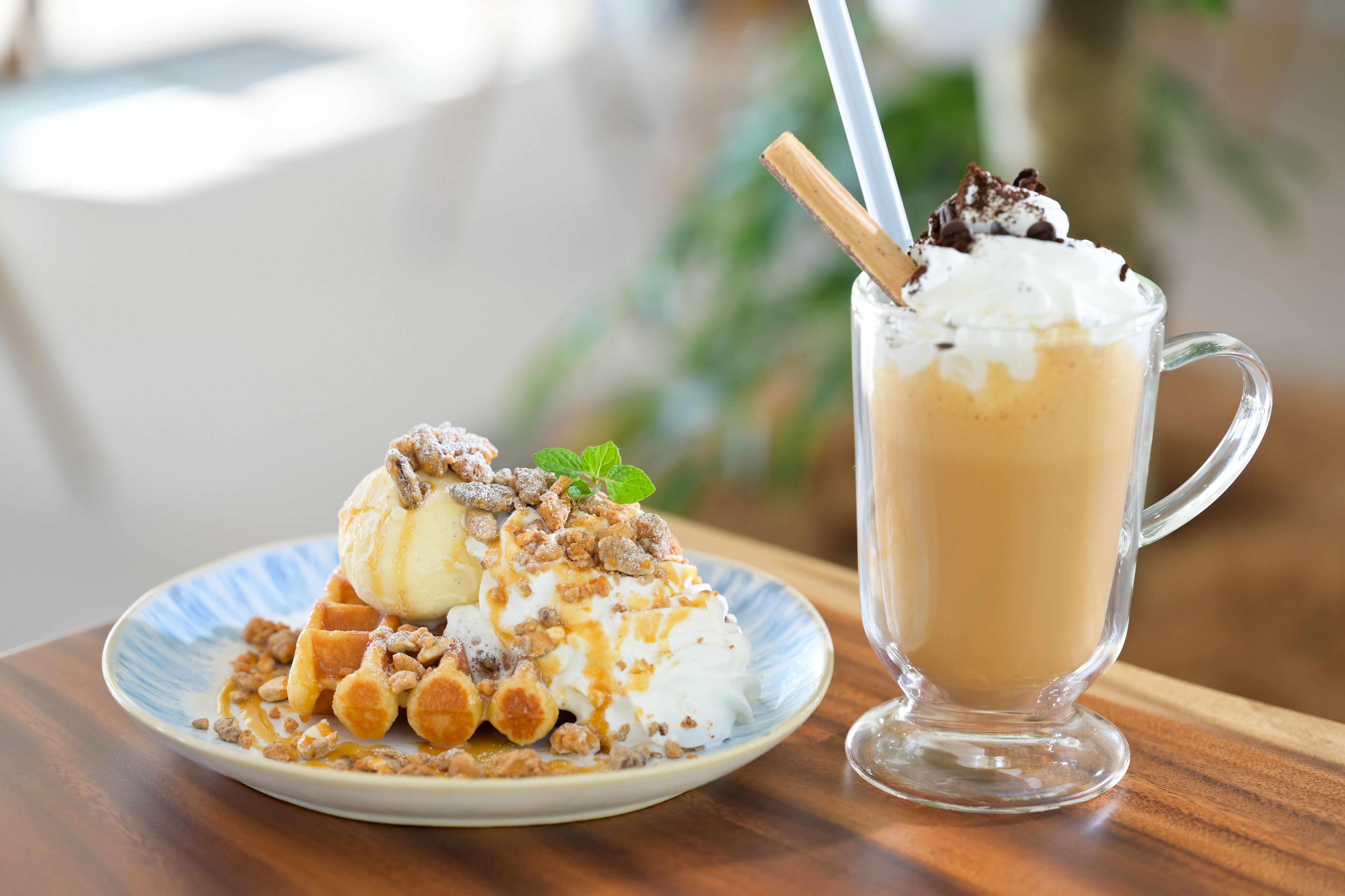 ワッフルに添えているジェラートは、横須賀のジェラテリア コンナカさんのものです。また、アフォガードシェイクなどコーヒーを使ったデザートドリンクもおすすめです。