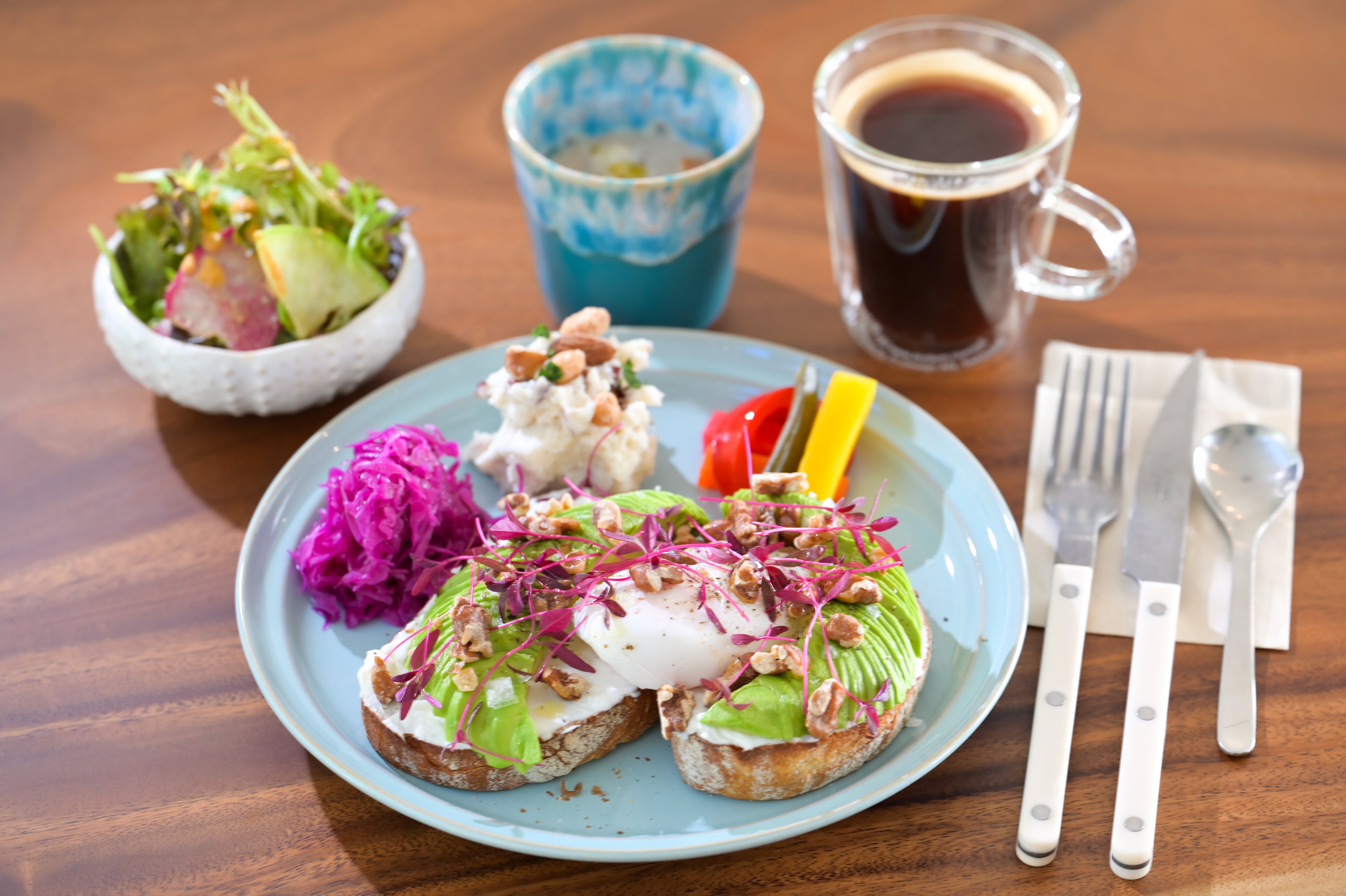 オープンサンドがおすすめで、アボカドとリコッタチーズを贅沢に使ったメニューが人気です。アメリカのカフェには必ずアボカドトーストがあるので、それをもう少し豪華にアレンジしました。また地元・佐島のしらすを使ったしらすチーズなどもあります。
