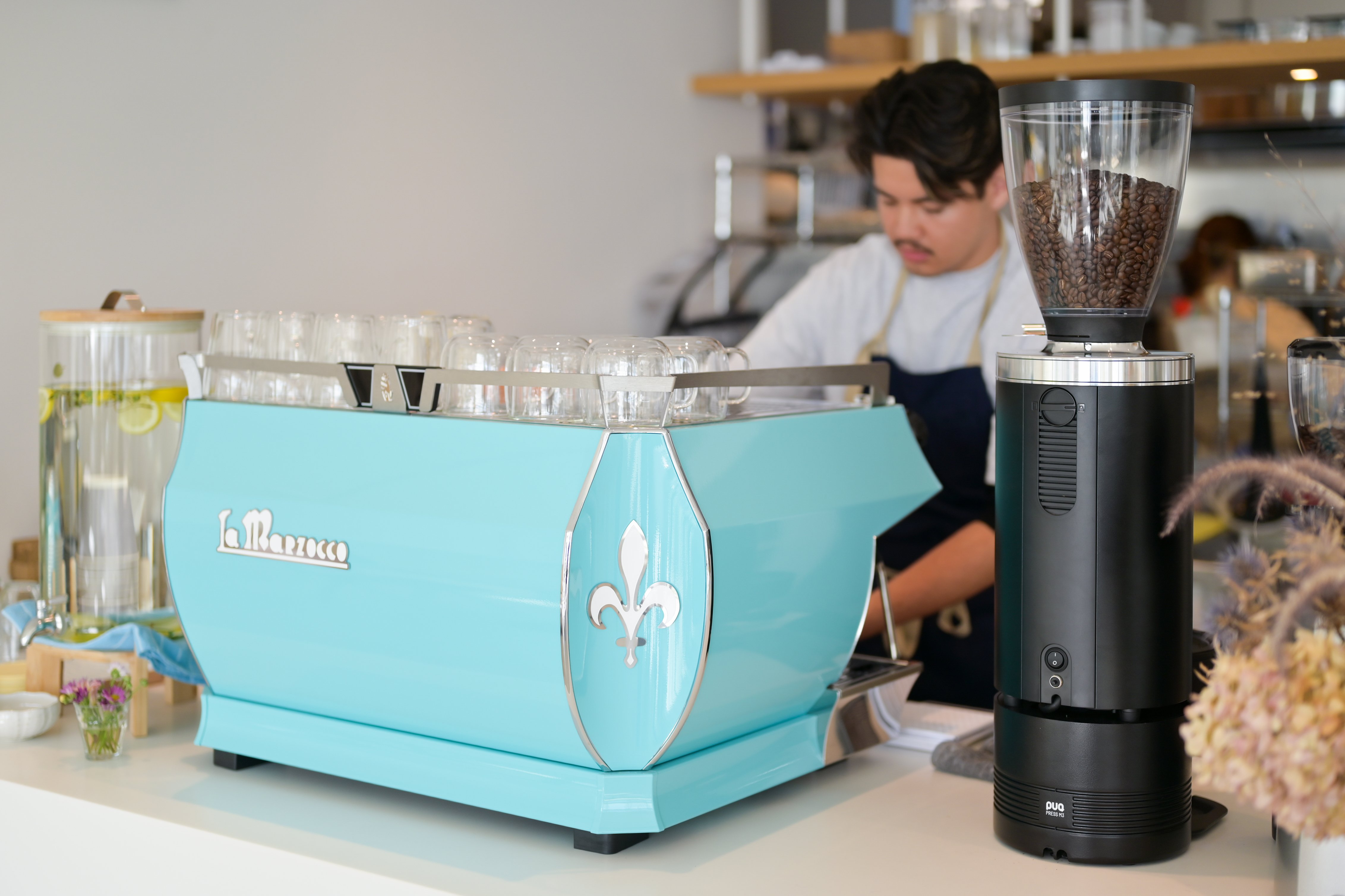 La Marzocco GB5 S 2グループを選びましたが、色をカスタマイズできるのが魅力的で、海と空をイメージしたスカイブルーを選びました。マシンを検討する段階から、カラーは絶対にカスタマイズしたいと思っていました。クラシックなデザインも気に入っています。カフェの建物自体は直線や三角形のラインが多いので、あえて曲線が美しいマシンを置くことで、より存在感を出せると考えました。使い心地としては、クラシックな機械的な動きが好きですね。スチームのパワーもしっかりあって、まるでクラシックカーのエンジンのような力強さを感じます。