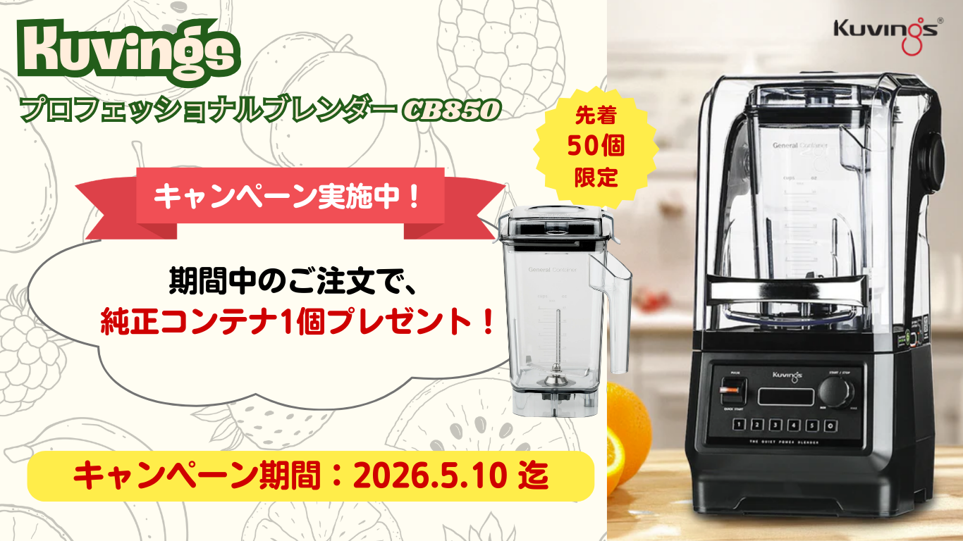 期間中 『Kuvings プロフェッショナルブレンダー CB850』を1台ご注文につき、純正コンテナを1個プレゼント